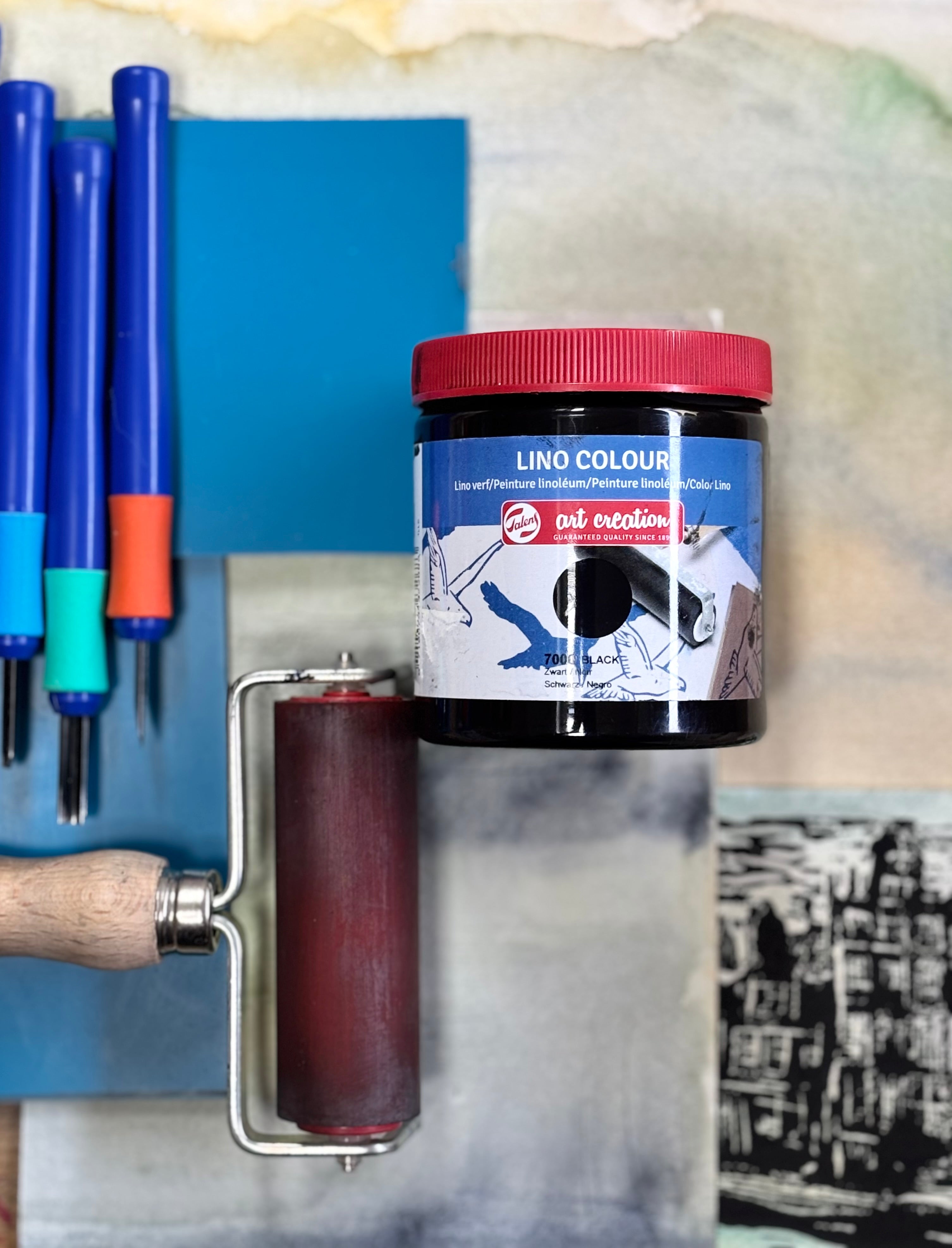 Daarna inkt en druk je je lino af — en breng je eventueel een sprankelende finishing touch aan met gelly roll, glow in the dark of pearl medium.