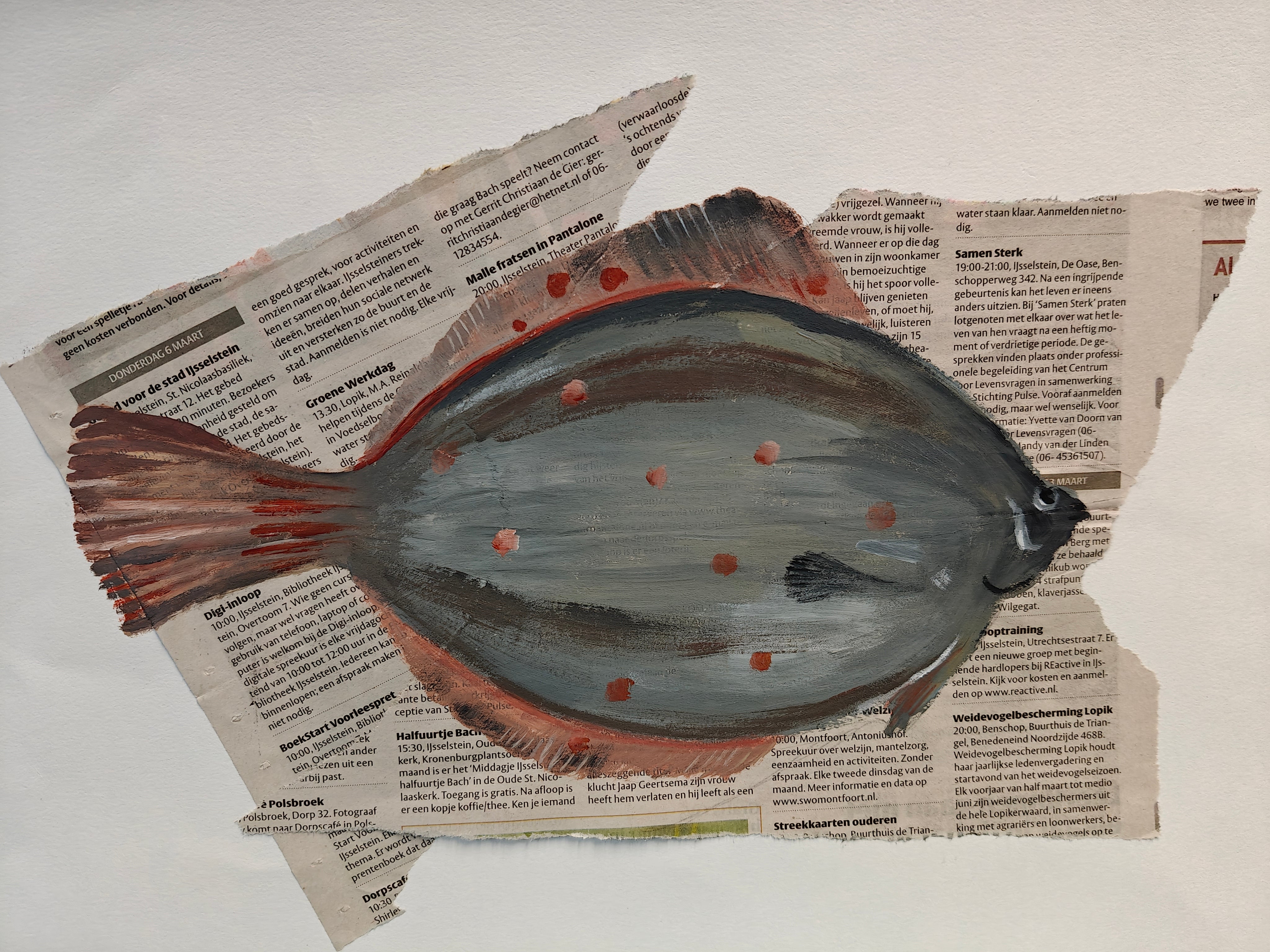Laat je inspireren door de charme van eenvoud: een platvis op een ondergrond van krant. In deze workshop leer je hoe je met verf en collage een verrassend kunstwerk maakt dat speels, stoer en eigenzinnig is.